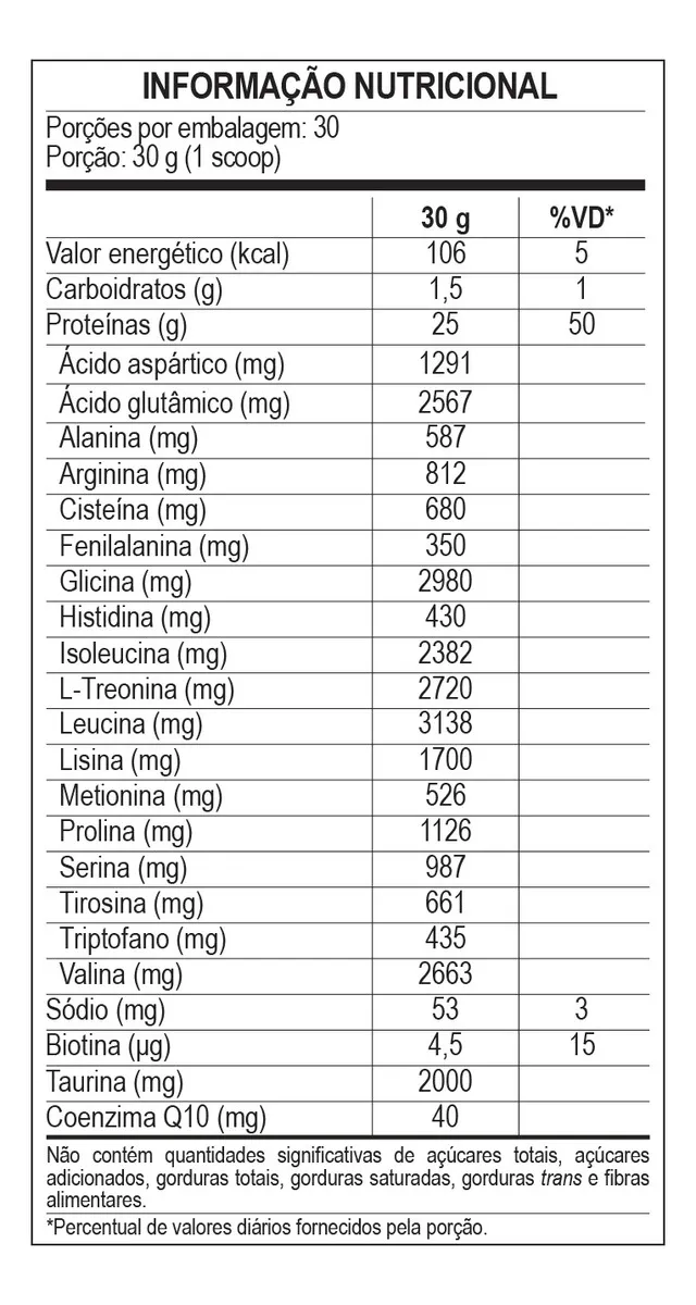 Isolate Prime Whey foi desenvolvido para aqueles que procuram whey de alto nível. Ele é composto 100% de Whey Isolado e Hidrolisado, possui 25g de proteína na dose, com CoQ10 e 10,3g de BCAA. Adoçado com Stevia, um adoçante natural. Ingredientes Proteína Isolada do Soro de Leite (WPI), Proteína Hidrolisada do Soro do leite (WPH), Coenzima Q10, Espessante Goma Xantana, Antiumectante Dióxido de Silício, Edulcorante Glicosídeo Steviól (Stévia rebaudiana). BAUNILHA: Aromatizante Natural de Flor de Baunilha. CHOCOLATE: Cacau em pó. MORANGO: Aromatizante Natural de Morango e Corante Natural Carmin. NÃO CONTÉM GLÚTEN. NÃO CONTÉM LACTOSE. ALÉRGICOS: CONTÉM DERIVADO DO LEITE. PODE CONTER DERIVADOS DO OVO E SOJA. Modo de Preparo Misture 30g (aproximadamente 1 scoop) com 150ml (1 copo pequeno) de água ou bebida de sua preferência. Variar a quantidade de líquido para obter o sabor e a consistência desejados. Sugestão de uso Consumir 1 (uma) porção 1 (uma) vez ao dia após o treino ou conforme orientado por nutricionista ou médico para satisfazer as suas necessidades de proteínas. Advertências “ESTE PRODUTO NÃO É UM MEDICAMENTO.” “MANTENHA FORA DO ALCANCE DE CRIANÇAS.” “ESTE PRODUTO NÃO DEVE SER CONSUMIDO POR GESTANTES, LACTANTES E CRIANÇAS”. Conservação Manter em lugar fresco, não úmido e ao abrigo da luz. Não consumir o produto se o lacre de proteção estiver violado. Após aberto consumir preferencialmente em 30 dias. - IMAGEM ILUSTRATIVA. Aviso legal • Idade mínima recomendada: 15 anos. • Consumir junto com alimentos para facilitar sua assimilação. • Este produto é um suplemento dietético, não um medicamento. Suplementa dietas insuficientes. Consulte o seu médico e/ou farmacêutico.