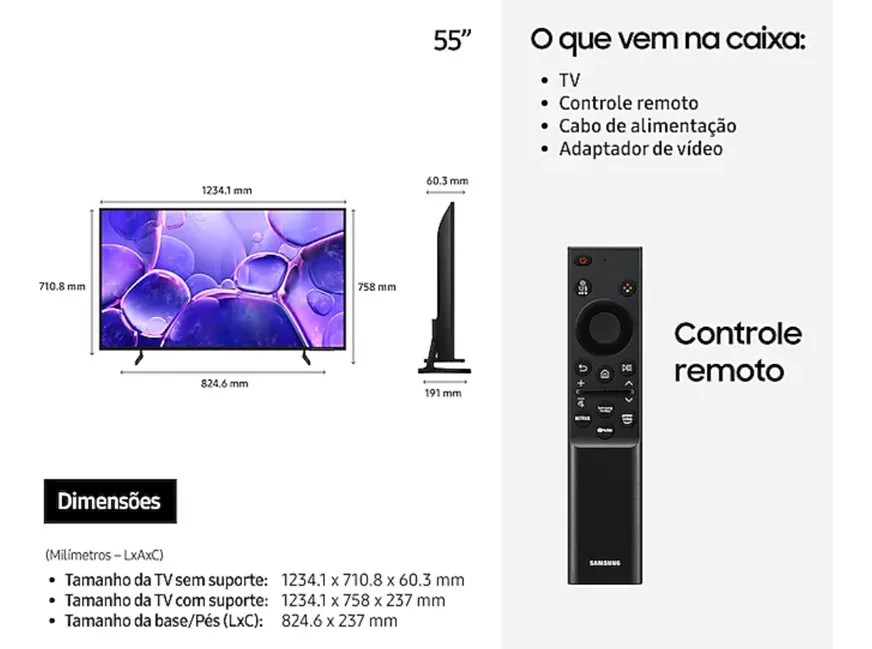Alexa, Google Assistant, Bixby Embutido. Conta com wi-fi y porto de rede. Possui 3 portas HDMI. Equipado com conexão USB. Com conectividade via Bluetooth Inclui controle remoto. Dimensões: 1.23m de largura, 71.08cm de altura e 6.03cm de profundidade.