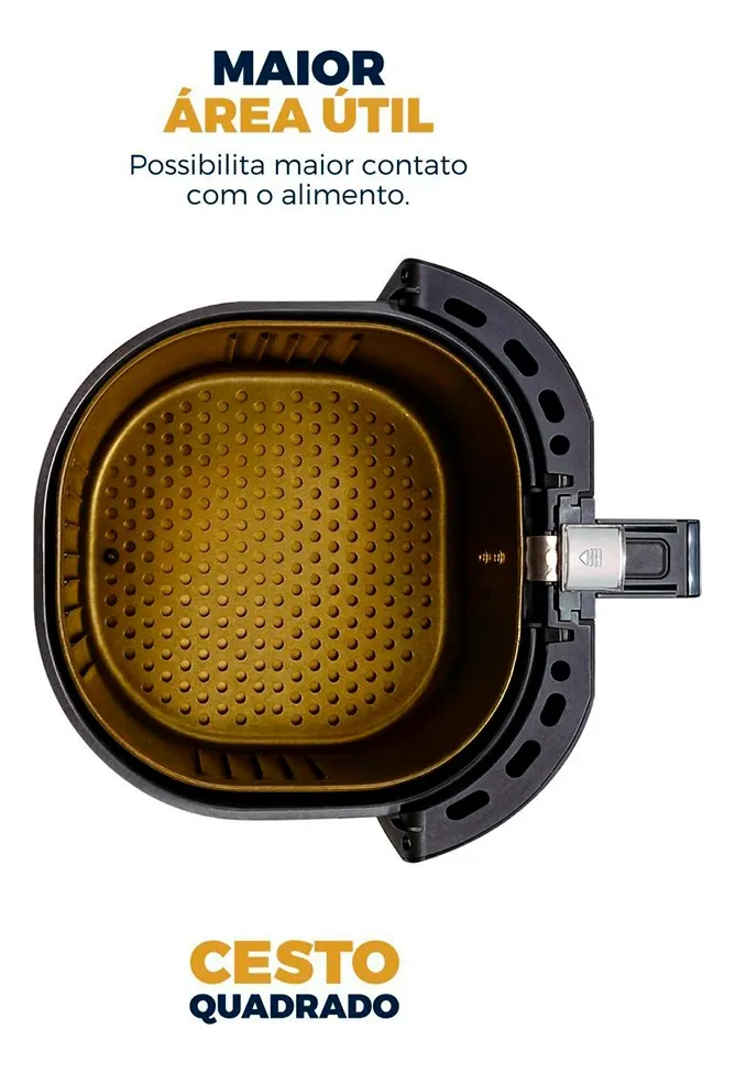 Capacidade (L): 5 Tipo de fritura: Frita com pouco ou sem nenhum óleo Revestimento antiaderente: Sim Cesto removível: Sim Controle de temperatura: 80 a 200°C Timer: Sim Desligamento automático: Sim Trava de segurança: Sim Base antiderrapante: Sim Porta fio: Não possui Capacidade Bruta (L): 5 Voltagem: 110V ou 220V (não é bivolt) Consumo (kWh): 1,5 Potência (W): 1500 Peso (kg): 3.82 Referência: BAF45A Dimensões (AxLxP): 28,8x28,2x33,7cm Registro: SGS OCP 0040 Itens Inclusos: 1 Fritadeira Air Fryer Britânia BAF45A 5L 1500W Antiaderente Gold Tecnologia Air Flow 360° Manual do produto Tomada (A): 127v-20A 220v-10A Informações importantes: Imagens meramente ilustrativas. Objetos que ambientam as fotos não acompanham o produto. As tonalidades das cores dos produtos podem sofrer alterações de acordo com a calibração do seu monitor. Este produto não inclui montagem e instalação. Eventuais despesas são de responsabilidade do cliente.