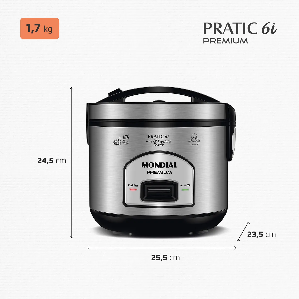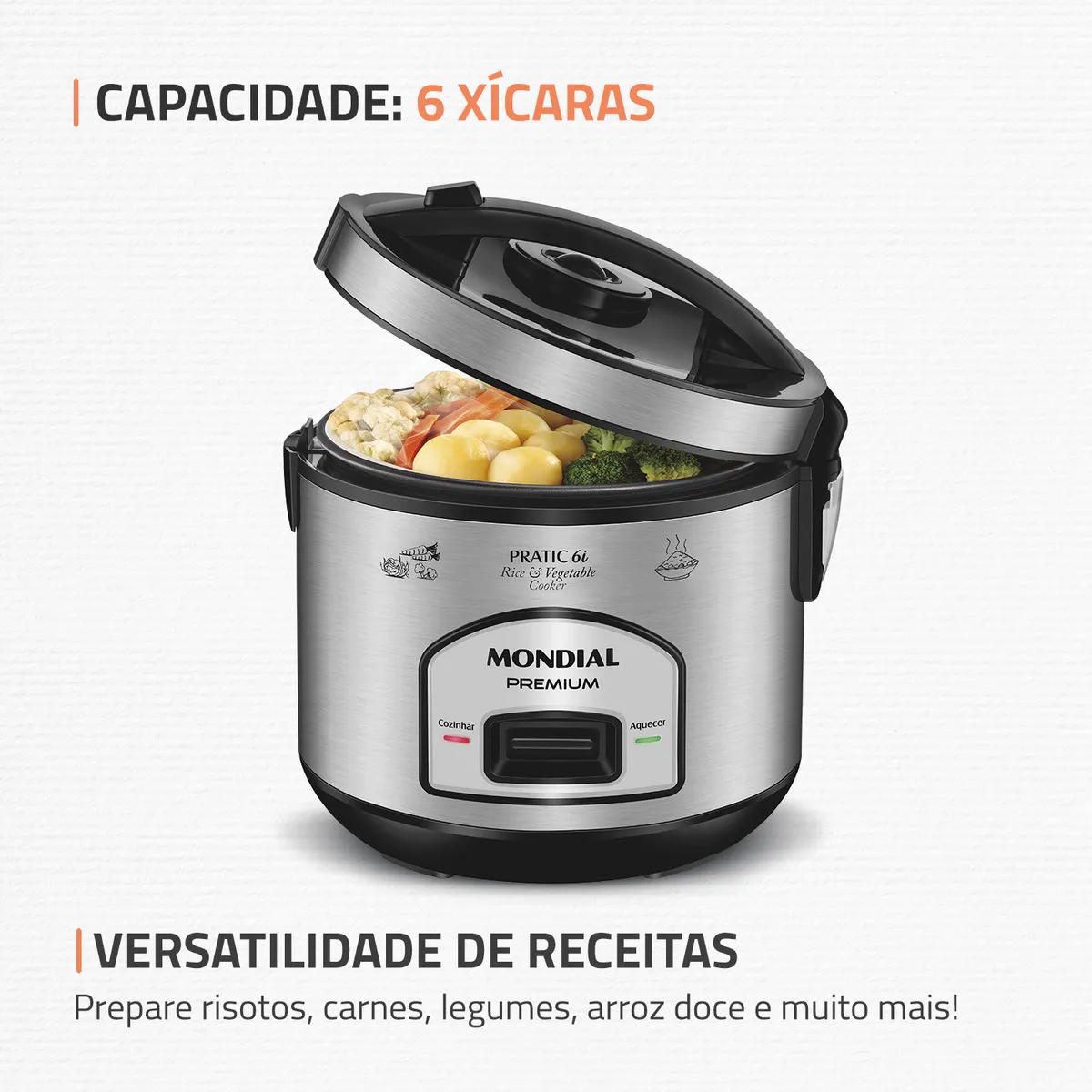 Prepare deliciosas receitas para sua família com a Panela Elétrica Pratic 6i Premium Mondial. A cuba antiaderente é removível e tem capacidade para 6 xícaras. Acompanha cesto que cozinha alimentos no vapor, preservando todos os nutrientes. Possui função aquecer, que mantém o alimento quentinho mesmo após terminar o preparo. Além disso, o design em inox garante sofisticação para sua cozinha. Saiba mais sobre a PE-43-6X da Mondial: CAPACIDADE DE 6 XÍCARAS A panela de arroz Mondial tem a capacidade ideal para o arroz do dia a dia e outras receitas. VERSATILIDADE DE RECEITAS Prepare arroz, risotos, legumes, molhos, arroz doce e muito mais! DESIGN SOFISTICADO Em aço inox, o acabamento garante beleza para sua cozinha e mais durabilidade. VÁLVULA DE SAÍDA DE VAPOR A Válvula de Saída de Vapor libera o excesso de vapor na panela, mantendo o calor interno necessário para um cozimento perfeito. FUNÇÃO AQUECER O sistema de aquecimento automático conserva o arroz fresco e quentinho por até 8 horas. ACESSÓRIO COZI VAPOR Acompanha cesto que permite cozinhar deliciosos legumes e verduras a vapor, sem perder seus nutrientes. CUBA ANTIADERENTE E REMOVÍVEL O revestimento antiaderente evita que os alimentos grudem e facilita a limpeza. LÂMPADA PILOTO Indica o funcionamento do aparelho. MAIS PRATICIDADE A tampa basculante com travamento e alça, permite a utilização prática e segura, além de facilitar o transporte. COLETOR DE VAPOR Recolhe a água condensada durante o funcionamento do produto. ACESSÓRIOS Acompanha colher e copo medidor. A Mondial é a escolha de milhões de consumidores. Mondial, a escolha inteligente!"