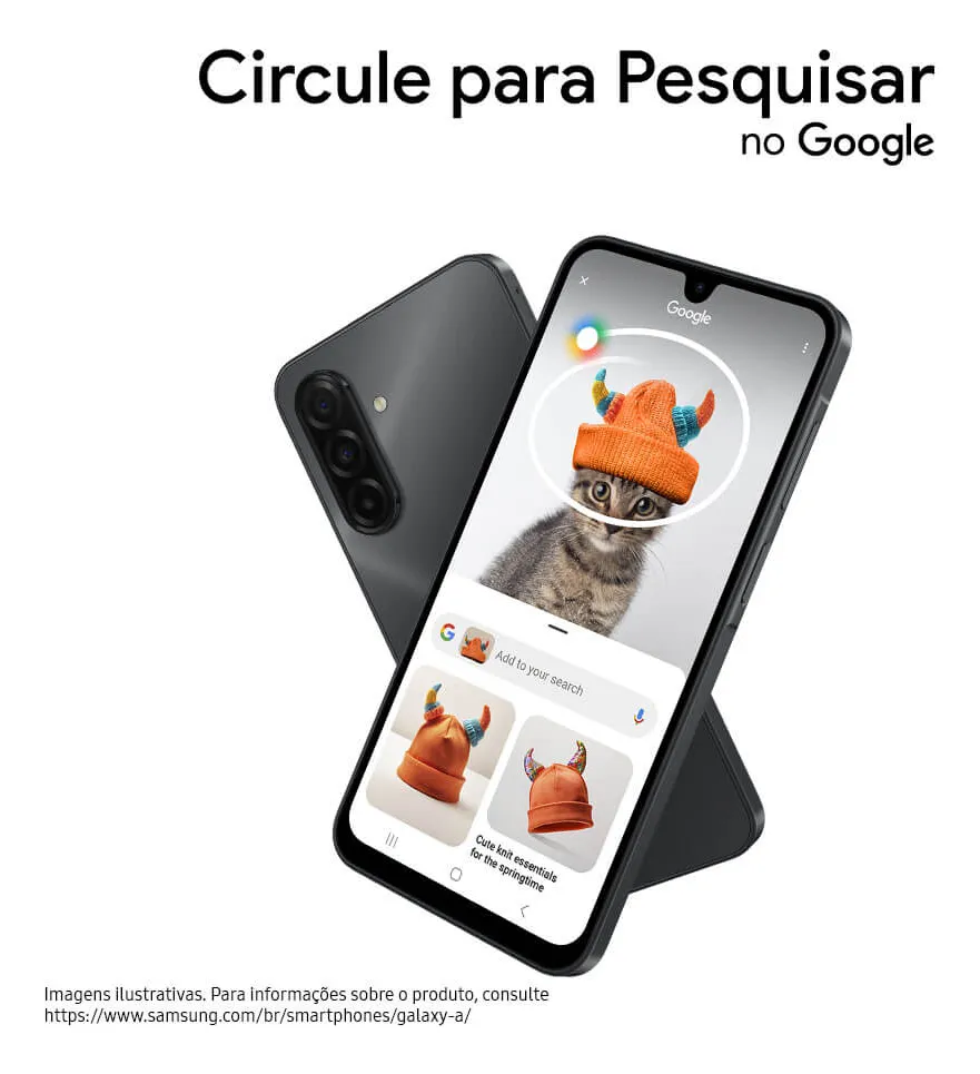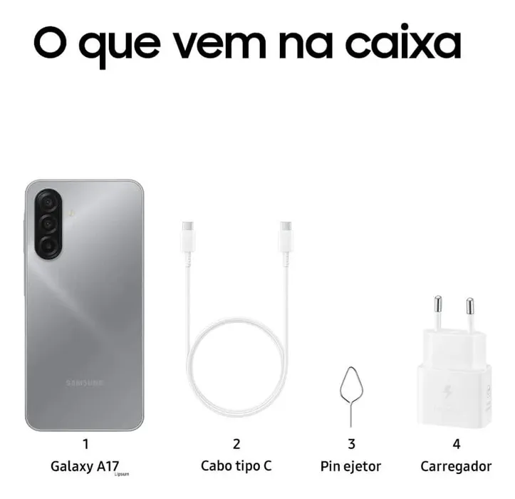Celular Samsung Galaxy A17, com IA integrada, 128GB, 4GB RAM, 4GB RAM Plus, Câmera Tripla Traseira de até 50MP, Câmera Frontal de 13 MP,Tela resistente Super AMOLED de 6.7", Processador Helio G99 Octa-Core de 6nm, Android 15 com 6 atualizações, IP54 resistencia à água e poeira, NFC, Samsung Wallet, Bateria de 5.000mAh, Dual Chip. O Galaxy A17 chegou para transformar a maneira como você se conecta, tendo tudo para ser seu primeiro Galaxy com IA. Com ele, você vai registrar cada momento com uma câmera tripla de até 50MP. Sua telona de 6,7" de Super AMOLED tem mais resistência. Feito para durar, modelo traz design moderno, acabamento premium, até 6 atualizações de Android e até seis anos de atualizações de segurança, proteção IP54 contra água e poeira, unindo estilo, funcionalidade e resistência em um só aparelho. Como novidade o novo Galaxy A17 possui Gemini integrado e o Circule para Pesquisar, ferramentas de IA do Google. O Gemini integrado enriquece seu dia a dia com um assistente de IA que é fácil de usar, que entende o que você diz de maneira natural. Com um simples toque no botão lateral você acessa o Gemini rapidamente. Com a ação integrada entra aplicativos, o Gemini integra não somente aplicativos Google, mas também aos aplicativos nativos do Galaxy e de terceiros para oferecer assistência inteligente em toda a experiência do seu dispositivo. Usando o Circule para Pesquisar, você pode intuitivamente pesquisar qualquer coisa na tela, como imagens, músicas ou texto. Encontre respostas e ações necessárias rapidamente. Na pesquisa de imagens, basta circular um item ou objeto para visualizar informações adicionais sobre ele. Quer saber mais sobre uma música? Toque, cante ou cantarole para encontrar mais informações sobre ela. E com os pins de ação faça chamadas, envie e-mails ou visite um site com apenas um toque na tela. A câmera tripla de 50MP com estabilização óptica (OIS) permite que você capture cada detalhe de diferentes ângulos para fotos e vídeos criativos mesmo em movimento. Leve suas memórias para o próximo nível. A telona Super AMOLED de 6,7” FHD+ te entrega cores mais vivas, contraste profundo e brilho otimizado para qualquer ambiente, seja assistindo filmes, jogando ou navegando nas redes sociais. Fique despreocupado, o Gorilla Glass Victus te entrega durabilidade superior contra riscos e quedas. Feito para durar e atualizado por mais tempo, o Galaxy A17 oferece uma experiência duradoura e segura, assegurando até 6 atualizações de sistema operacional Android e até 6 anos de atualizações de segurança. Além disso, conta com proteção IP54, garantindo resistência à água e poeira. Sua segurança é aprimorada através do Samsung Knox Vault, garantindo que dados confidenciais e sigilosos, como senhas e pins de desbloqueio, permaneçam seguros. O seu acabamento sofisticado e fino, com espessura de 7,5mm e apenas 190g traz conforto e ergonomia. Com o aplicativo SmartSwitch você transfere de forma fácil e prática o conteúdo do seu celular anterior (fotos, contatos, eventos do calendário, notas, configurações do dispositivo e muito mais). O Galaxy A17 é mais do que um smartphone é seu novo parceiro para trabalhar, se divertir e se conectar, combinando tecnologia de ponta com a confiabilidade da Samsung.