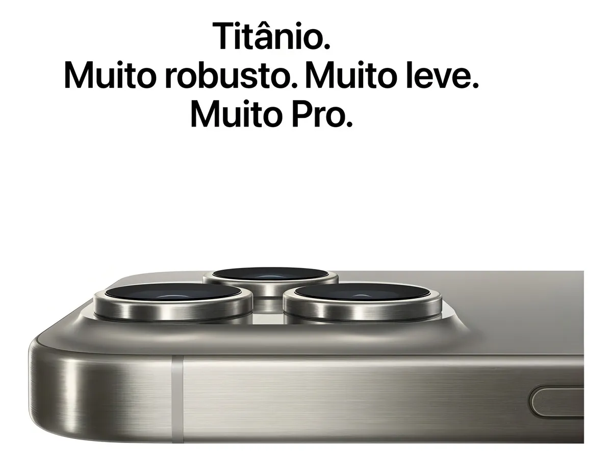 FORJADO EM TITÂNIO — O iPhone 15 Pro Max tem design robusto e leve em titânio aeroespacial. Na parte de trás, vidro matte texturizado e, na frente, Ceramic Shield mais resistente que qualquer vidro de smartphone. Ele também é durão contra respingos, água e poeira TELA AVANÇADA — A tela Super Retina XDR de 6,7 pol. com ProMotion aumenta as taxas de atualização para 120 Hz quando você precisa de gráficos mais impressionantes. A Dynamic Island mostra alertas e Atividades ao Vivo. Além disso, com a tela Sempre Ativa, você nem precisa tocar na Tela Bloqueada para ficar de olho em tudo. CHIP A17 PRO REVOLUCIONÁRIO — Com GPU de categoria Pro, os games para celular ficam mais imersivos, com ambientes detalhados e personagens muito realistas. O chip A17 Pro é incrivelmente eficiente e ajuda a garantir bateria para o dia todo SISTEMA DE CÂMERA PRO PODEROSO — Aumente suas possibilidades de enquadramento com sete lentes Pro. Fotografe em altíssima resolução e tenha mais cores e detalhes com a câmera grande-angular de 48 MP. Os closes vão ficar mais nítidos a uma distância ainda maior com a câmera teleobjetiva de 5x no iPhone 15 Pro Max. BOTÃO DE AÇÃO CONFIGURÁVEL — O botão de Ação deixa seu recurso favorito sempre à mão. Basta definir qual ação você quer usar, como modo Silencioso, Câmera, Gravador, Atalhos, entre outras. Depois, mantenha o botão pressionado para iniciar. CONECTIVIDADE PRO — Com a nova porta USB C, você recarrega seu iPhone 15 Pro Max com o mesmo cabo que usa para recarregar o Mac ou o iPad. Com USB 3, a velocidade de transferência de dados dá um salto enorme. E você transfere arquivos até duas vezes mais rápido usando Wi-Fi 6E RECURSO ESSENCIAL DE SEGURANÇA — Com a Detecção de Acidente, o iPhone é capaz de identificar se você sofreu um acidente grave de carro e ligar para a emergência se você não puder Aviso legal 1. A tela tem bordas arredondadas. Quando medida como um retângulo, a tela tem 6,12 polegadas (iPhone 15 Pro, iPhone 15) ou 6,69 polegadas (iPhone 15 Pro Max, iPhone 15 Plus) na diagonal. A área real de visualização é menor. 2. A duração da bateria varia de acordo com o uso e a configuração. Consulte apple.com/br/batteries para obter mais informações. 3. Requer cabo USB 3 com velocidade de 10 Gb/s para transferências até 20 vezes mais rápidas nos modelos de iPhone 15 Pro. 4. Wi-Fi 6E está disponível nos países e regiões em que há compatibilidade. 5. O iPhone 15 e o iPhone 15 Pro são capazes de identificar um acidente grave de carro e ligar para os serviços de emergência. Requer uma conexão de rede celular ou chamadas Wi-Fi.