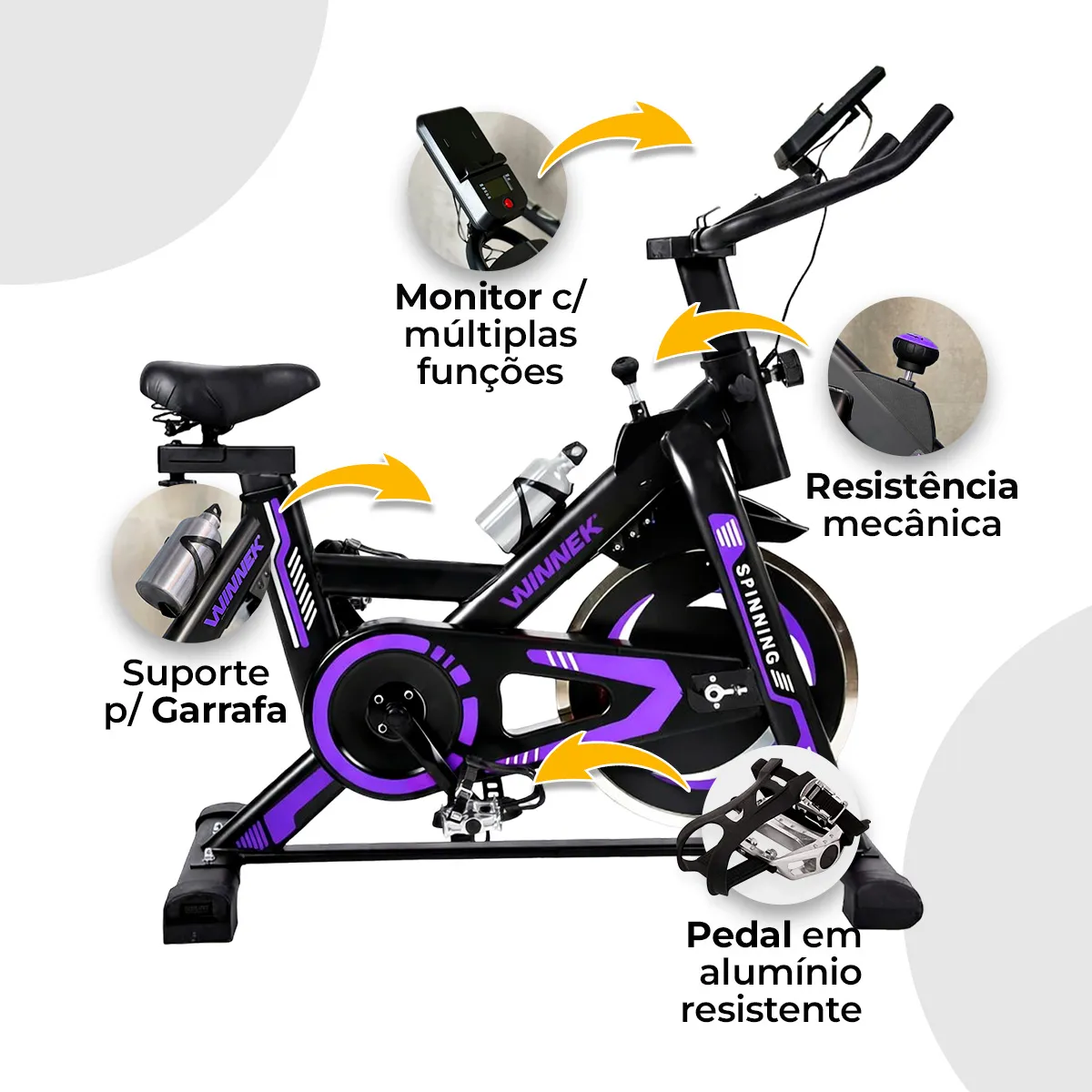 Bicicleta Ergométrica Spinning Com Roda Inércia De 13kg Mecânica Cor Preto Roxa -mecanica Suporte Para Celular / Tablet - Winnek Spin Force