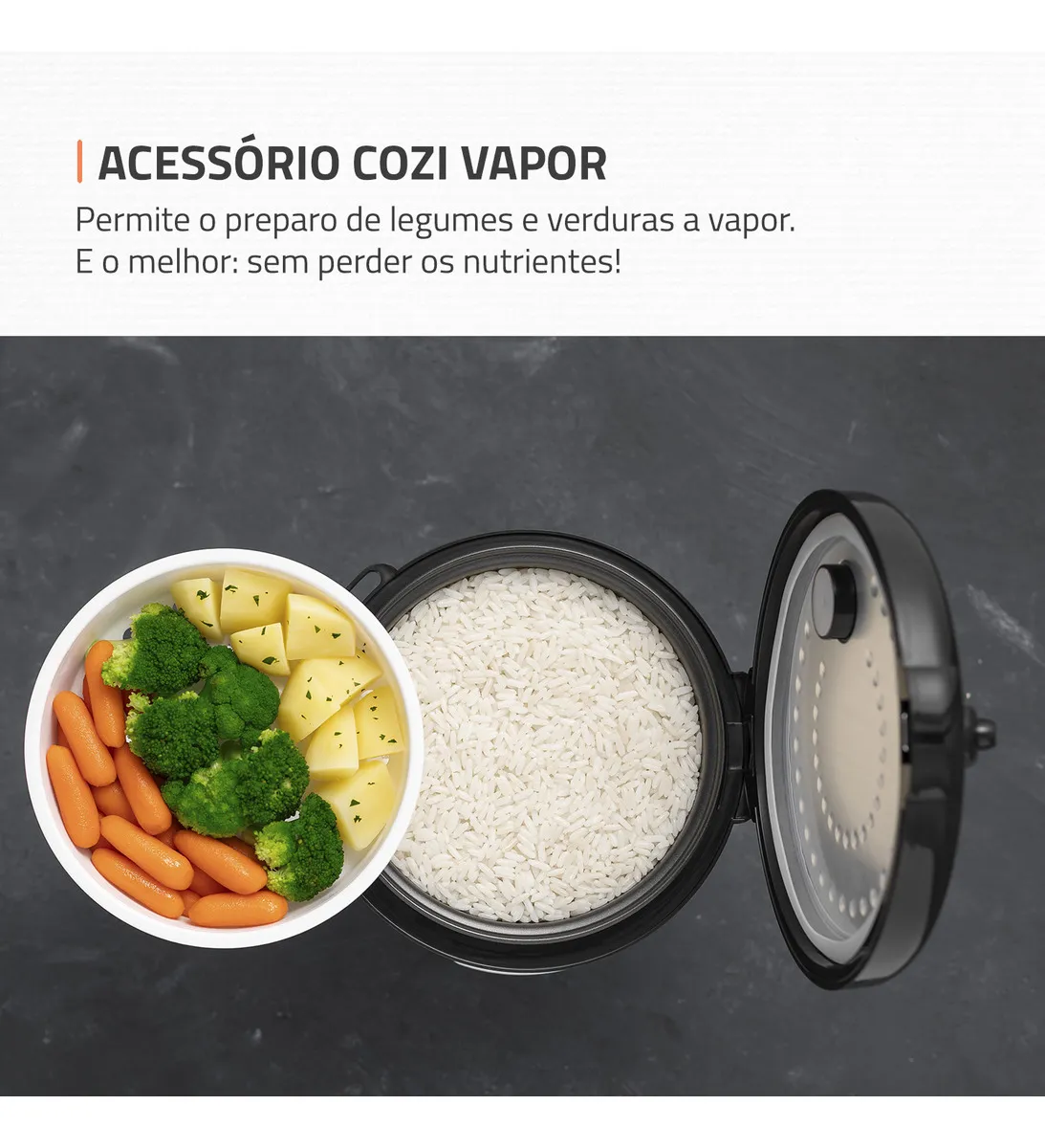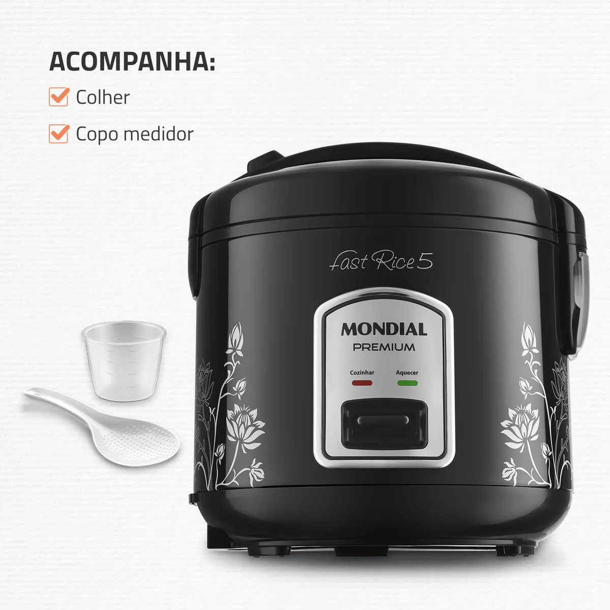 A Panela de Arroz Fast Rice 5 Premium Mondial garante um arroz saboroso e soltinho todos os dias. Com capacidade de 5 xícaras, prepara a quantidade certa para uma refeição em família. Possui cuba removível com revestimento antiaderente, cesto cozi vapor e conta com a função aquecer, deixando suas receitas sempre quentinhas. Acompanha colher que não risca a cuba e um copo medidor. Saiba mais sobre a NPE-08-5X da Mondial: CAPACIDADE DE 5 XÍCARAS A panela de arroz Mondial tem a capacidade ideal para o arroz do dia a dia e outras receitas. VERSATILIDADE DE RECEITAS Prepare arroz, risotos, legumes, molhos, arroz doce e muito mais! VÁLVULA DE SAÍDA DE VAPOR A Válvula de Saída de Vapor libera o excesso de vapor na panela, mantendo o calor interno necessário para um cozimento perfeito. FUNÇÃO AQUECER O sistema de aquecimento automático conserva o arroz fresco e quentinho por até 8 horas. ACESSÓRIO COZI VAPOR Acompanha cesto que permite cozinhar deliciosos legumes e verduras a vapor, sem perder seus nutrientes. CUBA ANTIADERENTE E REMOVÍVEL O revestimento antiaderente evita que os alimentos grudem e facilita a limpeza. LÂMPADA PILOTO Indica o funcionamento do aparelho. DECORAÇÃO EXCLUSIVA Mais charme e beleza em sua cozinha. MAIS PRATICIDADE A tampa basculante com travamento e alça, permite a utilização prática e segura, além de facilitar o transporte. COLETOR DE VAPOR Recolhe a água condensada durante o funcionamento do produto. ACESSÓRIOS Acompanha colher e copo medidor. A Mondial é a escolha de milhões de consumidores. Mondial, a escolha inteligente!