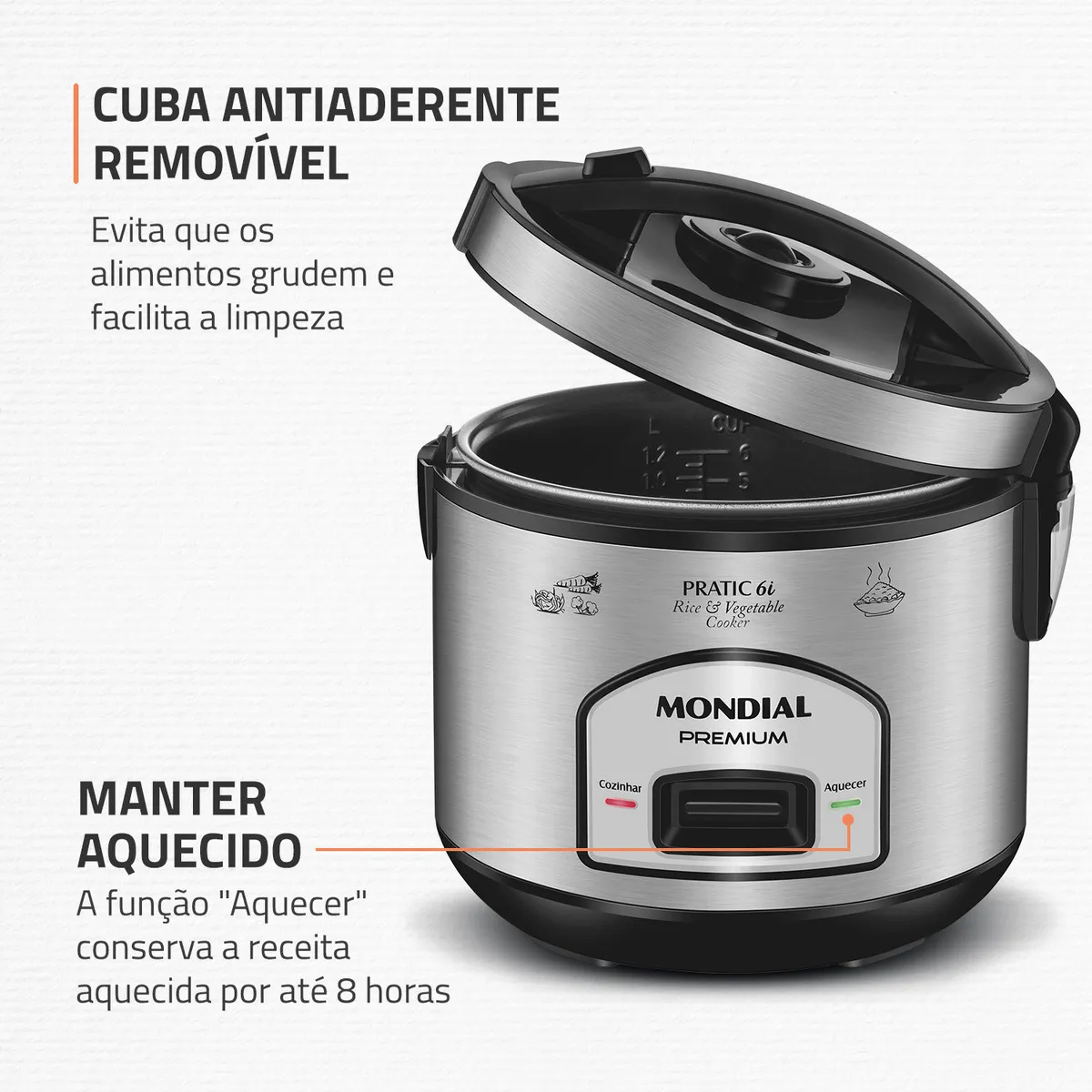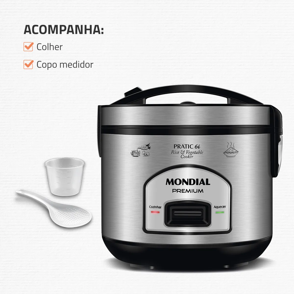 Prepare deliciosas receitas para sua família com a Panela Elétrica Pratic 6i Premium Mondial. A cuba antiaderente é removível e tem capacidade para 6 xícaras. Acompanha cesto que cozinha alimentos no vapor, preservando todos os nutrientes. Possui função aquecer, que mantém o alimento quentinho mesmo após terminar o preparo. Além disso, o design em inox garante sofisticação para sua cozinha. Saiba mais sobre a PE-43-6X da Mondial: CAPACIDADE DE 6 XÍCARAS A panela de arroz Mondial tem a capacidade ideal para o arroz do dia a dia e outras receitas. VERSATILIDADE DE RECEITAS Prepare arroz, risotos, legumes, molhos, arroz doce e muito mais! DESIGN SOFISTICADO Em aço inox, o acabamento garante beleza para sua cozinha e mais durabilidade. VÁLVULA DE SAÍDA DE VAPOR A Válvula de Saída de Vapor libera o excesso de vapor na panela, mantendo o calor interno necessário para um cozimento perfeito. FUNÇÃO AQUECER O sistema de aquecimento automático conserva o arroz fresco e quentinho por até 8 horas. ACESSÓRIO COZI VAPOR Acompanha cesto que permite cozinhar deliciosos legumes e verduras a vapor, sem perder seus nutrientes. CUBA ANTIADERENTE E REMOVÍVEL O revestimento antiaderente evita que os alimentos grudem e facilita a limpeza. LÂMPADA PILOTO Indica o funcionamento do aparelho. MAIS PRATICIDADE A tampa basculante com travamento e alça, permite a utilização prática e segura, além de facilitar o transporte. COLETOR DE VAPOR Recolhe a água condensada durante o funcionamento do produto. ACESSÓRIOS Acompanha colher e copo medidor. A Mondial é a escolha de milhões de consumidores. Mondial, a escolha inteligente!"